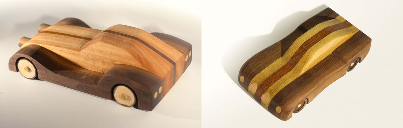 Cars and airplanes crafted from solid wood.