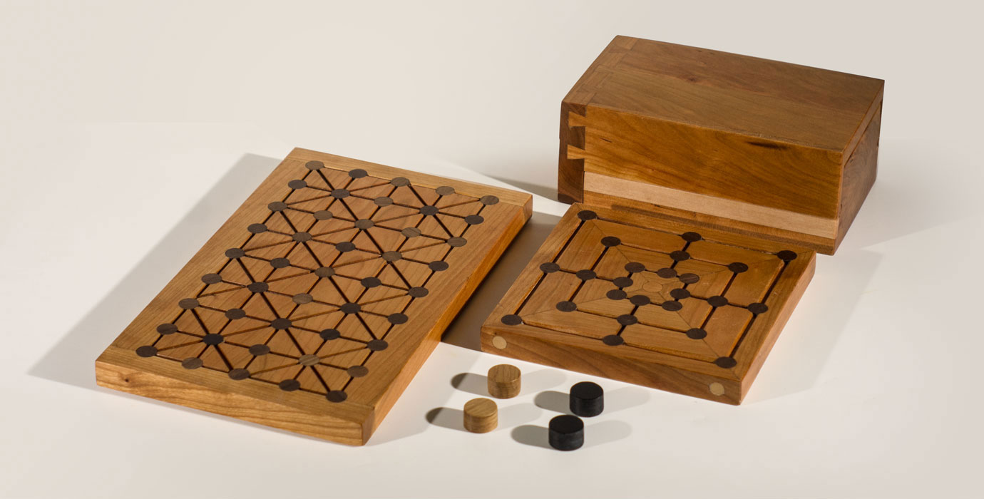 These Nine Mens Morris and Fanorona boards were made from cherry and black walnut. The game pieces were made from live oak (plain and ebonzed). The carrier was build from cherry.